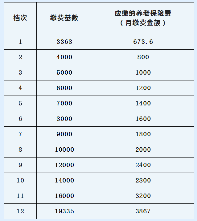 根据此文件精神,结合我省实际情况,省人社厅、税务局联合印发《关于发布2021年上半年灵活就业人员社会保险缴费基数的通知》(苏人社发〔2020〕151号),明确:“2021年1月1日至2021年6月30日,无雇工的个体工商户和灵活就业人员自愿参加企业职工基本养老保险的,缴费工资基数分为十二档,依次为3368元、4000元、5000元、6000元、7000元、8000元、9000元、10000元、12000元、14000元、16000元及19335元。” 无雇工的个体工商户和灵活就业人员可自主选择适当档次的缴费工资基数,缴纳企业职工基本养老保险费,详情见下表。