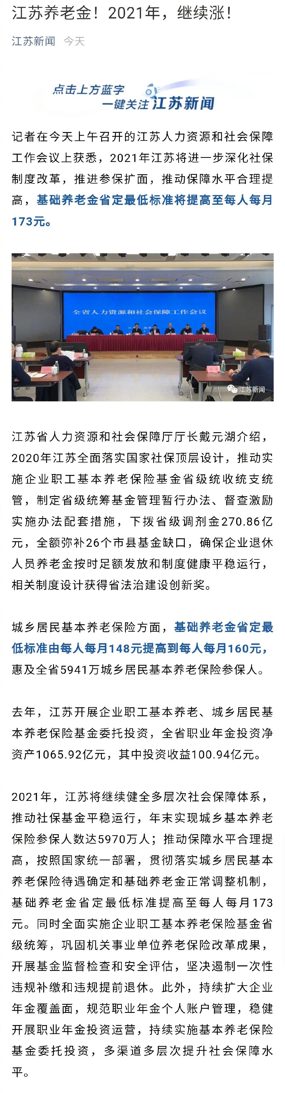 2021年,江苏将继续健全多层次社会保障体系,年末实现城乡基本养老保险参保人数达5970万人,基础养老金省定最低标准提高至每人每月173元。全面实施企业职工基本养老保险基金省级统筹,开展基金监督检查和安全评估,坚决遏制一次性违规补缴和违规提前退休。