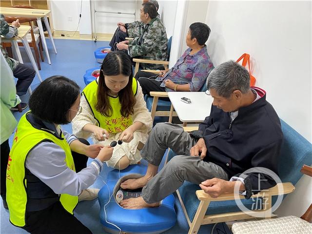 “退役军人服务之家”8个橘黄色大字下面,几名老兵静静地躺在座椅上,享受着按摩器带来的舒适,志愿者为他们测量血压、血糖。