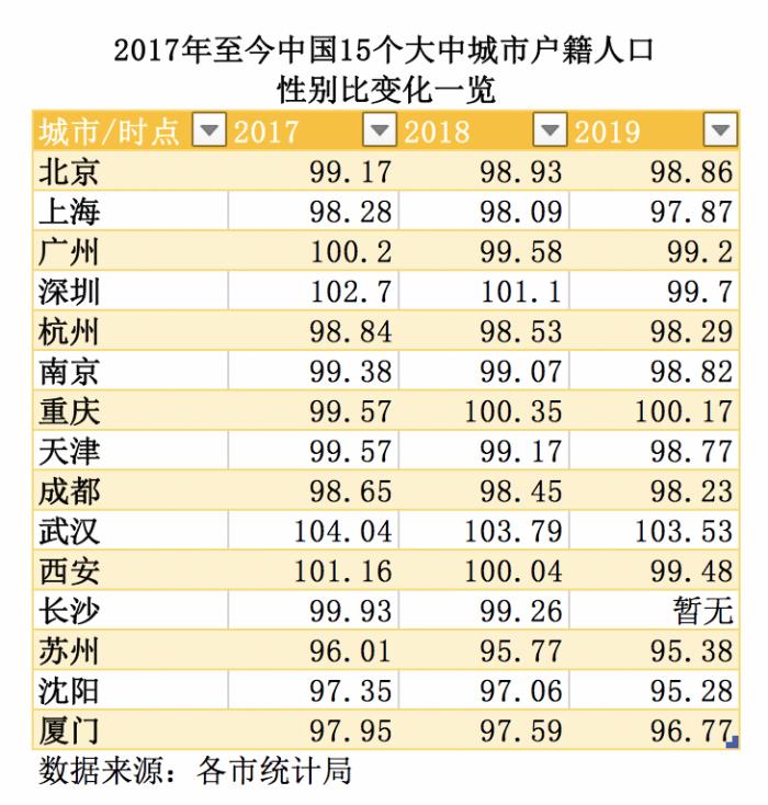 各城市户籍人口性别比均出现波动下滑。除重庆与武汉外,其余样本城市在2019年的性别比均已跌破100,即呈现“女多男少”的局面。