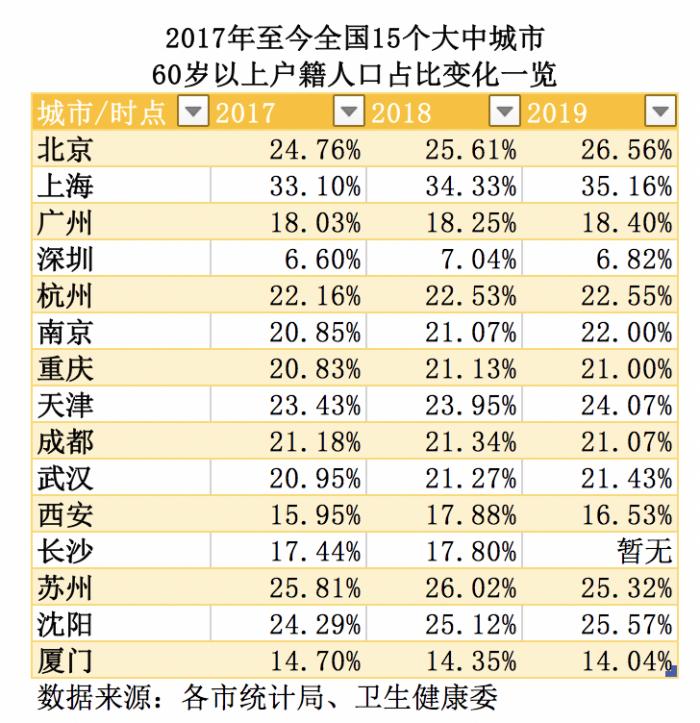 记者观察发现,在3年中,样本城市的老龄化程度总体提升。但值得注意的是,在2019年,重庆、成都、西安、苏州、厦门等地的60岁以上户籍人口同比略有下降。这在一定程度上与上述城市逐渐放宽落户限制相关。以西安为例,在2019年2月,该市进一步放宽户籍准入条件,本科及以上学历落户不受年龄限制,全国高等院校在校学生均可落户。