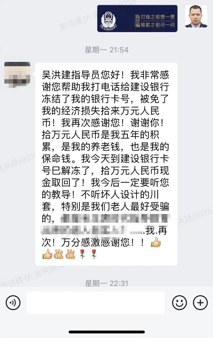 “吴洪建指导员你好!我非常感谢您,避免了我的经济损失。拾万元是我五年的积累,是我的养老钱,也是我的保命钱……万分感激感谢你!!”6月21日晚,家住赵宅的老王,向前一天帮助他的辅警吴洪建发来一段感谢语。