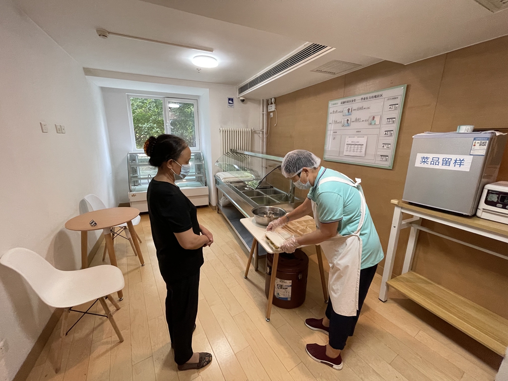 11时30分,70岁的李大妈第一个来到就餐区:“今天有炒黄瓜和烧茄子吧!我都闻到香味儿了。”戚嫣然立刻递上盛好的饭菜:“给您一样菜打了一份儿,您带回家吃。”一直到一个小时后用餐结束,共有30余位老人来到驿站打饭,每一位老人的停留时间不超过2分钟。