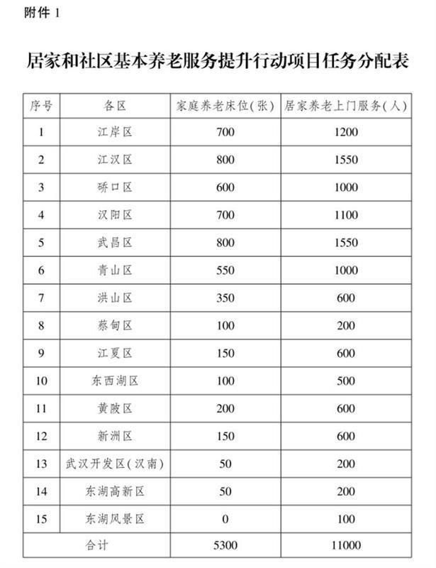 武汉市政府官网9月18日发布《武汉市居家和社区基本养老服务提升行动项目实施方案》,要求到2022年2月底前,全市建成家庭养老床位不少于5300张,服务人数不少于11000人。