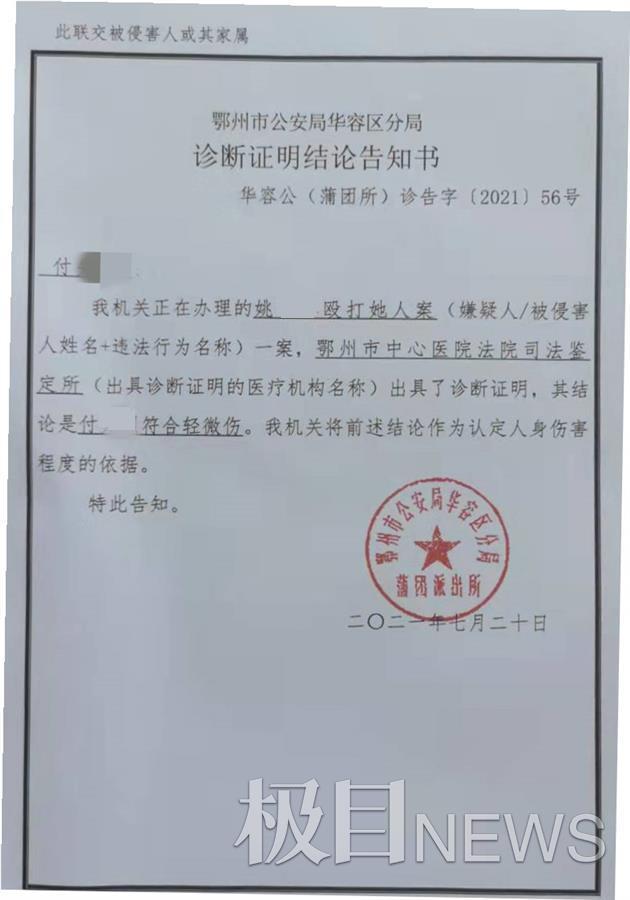 当晚,鄂州市公安局华容区分局蒲团派出所民警便介入了调查。“左侧额颞部头皮肿胀、青紫,按痛;胸部压痛,左前臂皮肤多处肿胀、青紫;双侧大腿肿胀,青紫。”鄂州市中心医院法医司法鉴定所提供的一份法医鉴定中诊断:多处损失;头皮挫伤;胸壁挫伤;左前臂挫伤;双大腿挫伤……