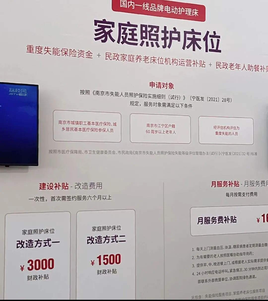 “申请家庭照护床位的对象只要一次性支付不到2000元的价格,就能够享受到一张电动护理床和一批物联网智能报警设备。每月再支付180元左右就能享受到专业机构提供的早间查房、一日三餐和紧急情况的上门救助等服务。” 南京市江宁区民政局副局长王津东口中所说的,正是该局叠加各类政策破解失能老年人居家养老难题的创新做法。