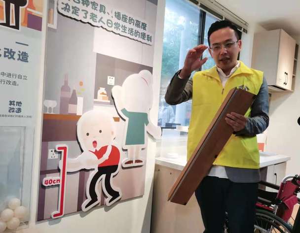 (静安区适老化改造项目夏甘霖正在介绍房屋高低差装置摄影:魏娜)