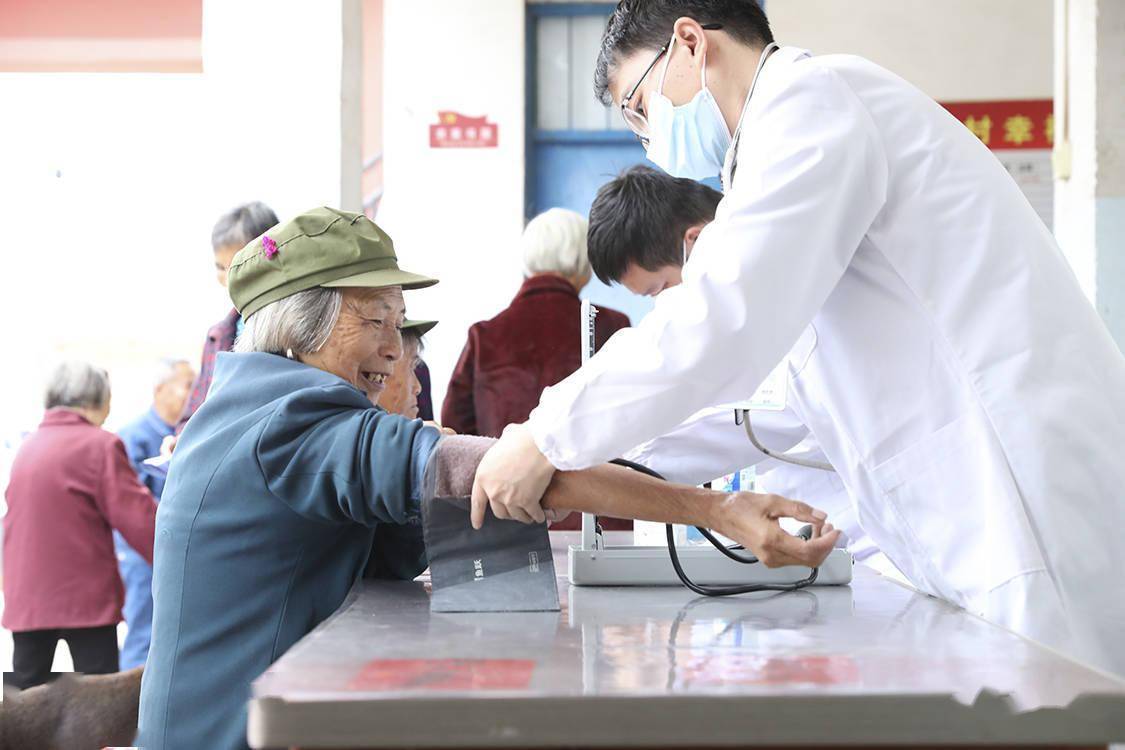 在“幸福之家”吃了三个月后,77岁的老人祝求祥高兴地说:“食堂饭菜口味清淡,菜量适中,符合我们的健康需求,医生都说我现在高血压病情都稳定了许多。图为2021年10月14日,乐安县湖溪乡卫生院医务人员为康村村的老年人量血压。(邱志超摄/光明图片)