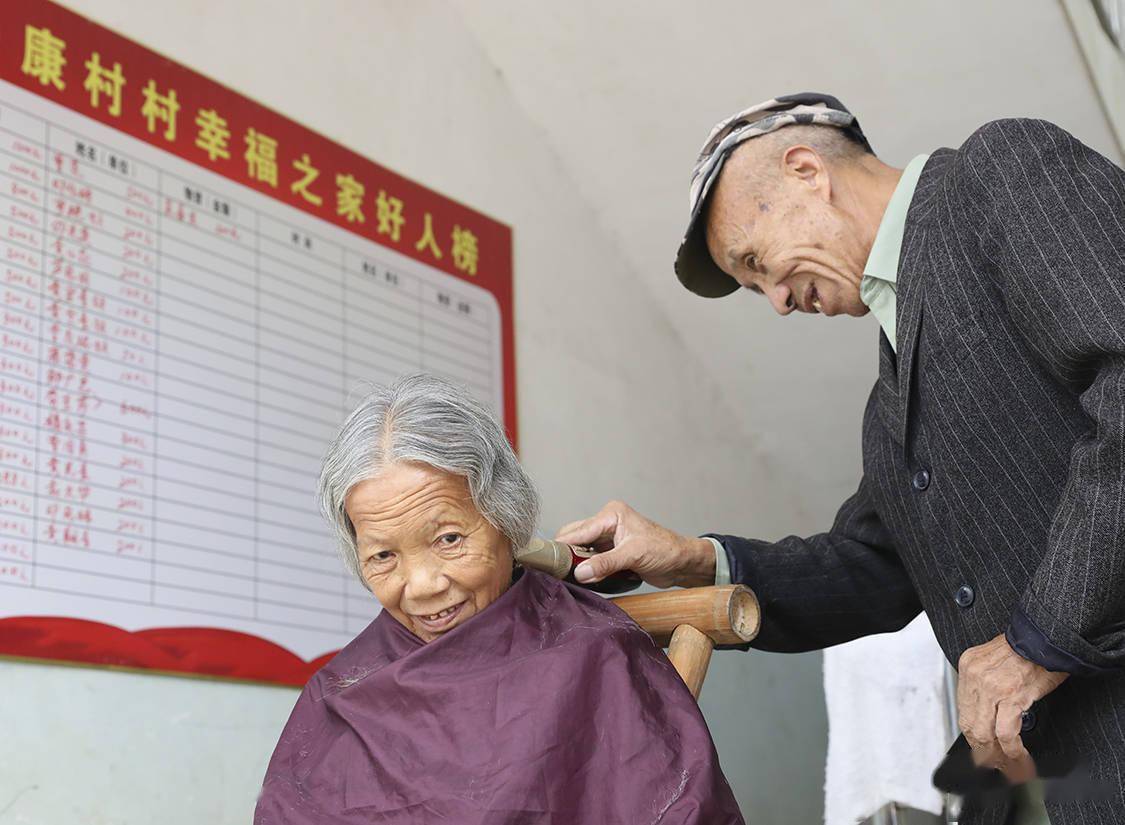 拿着6月至8月份算好的“幸福之家”账单,康村村党支部书记罗承辉高兴地说道:“就餐补贴和老人们个人出的钱再减去伙食开支,还结余了6400多元。能结余这么多钱,是黄官星、黄德星和曾有根几位老党员的功劳,他们一门心思为了办好村里的‘幸福之家’而操心。”图为2021年10月14日,理发人员正在为康村村老年人理发,欢度重阳节。(邱志超摄/光明图片)