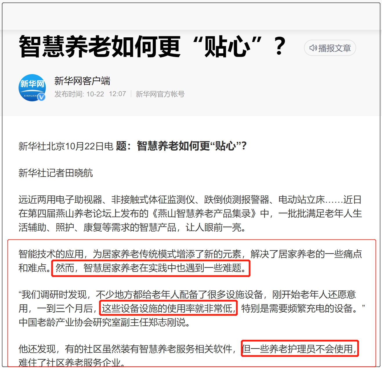 提起智慧养老,老年人身在其中,既是科技浪潮中的尝鲜体验者,也是智慧养老产品的检验者。现实中,正如大家所关注的“智能技术的应用,为居家养老传统模式增添了新的元素,解决了居家养老的一些痛点和难点。然而,智慧居家养老在实践中也遇到一些难题”