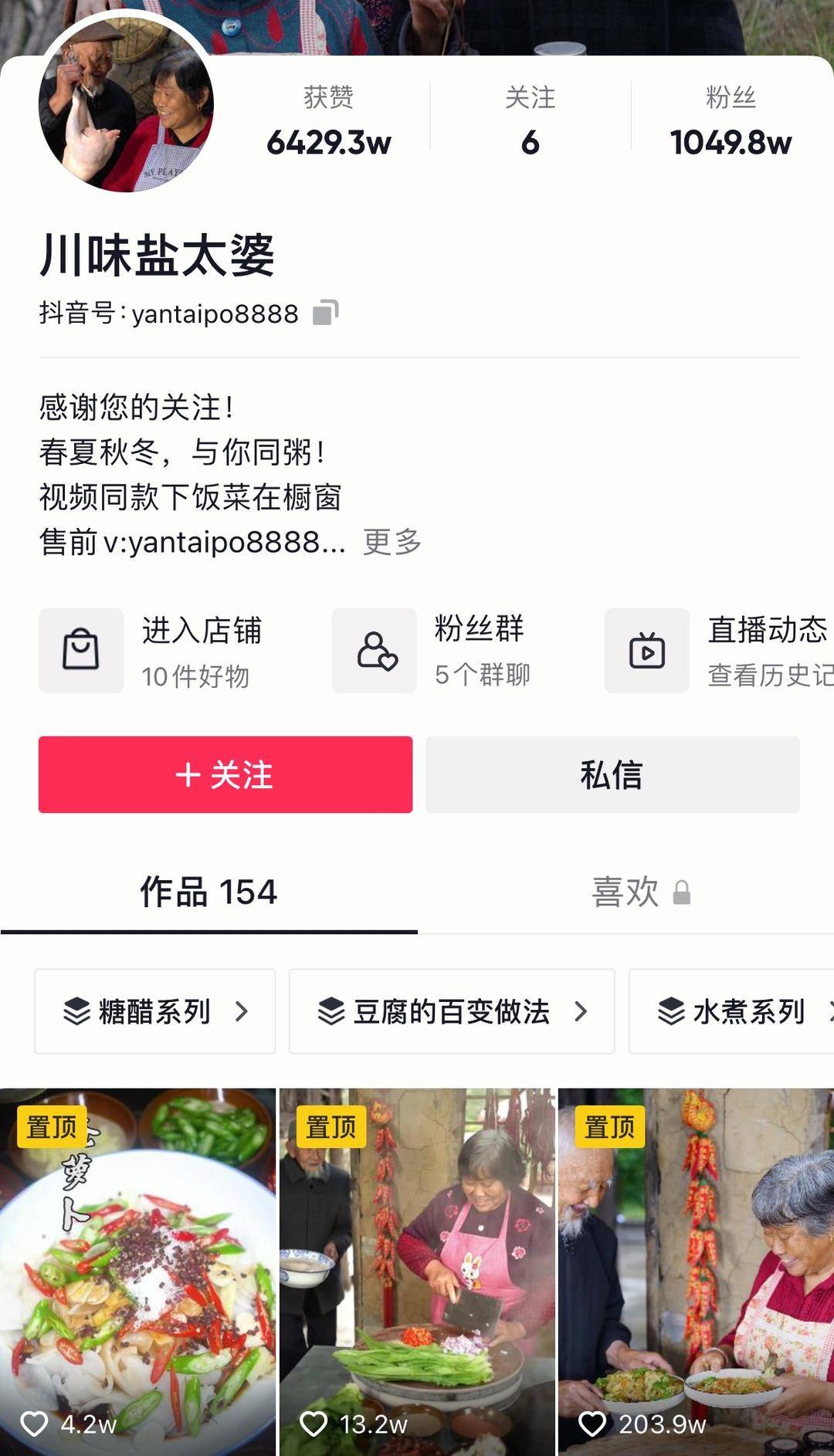 另外一个在短视频平台吸引了大量粉丝的“川味盐太婆”账号,则给人们展现出一对幽默老夫妻靠做饭圈粉的故事,通过录制川菜教程,漆爷爷和阎婆婆的抖音号已经积累超过1000万粉丝。接连收获的关注和点赞让老两口的孙子非常惊喜,自从录了视频,老两口的精气神也更好了,全家人都希望通过视频号把家乡特色产品“带出去”,同时把外地游客“引进来”,带动村里邻里增收致富,也促进家乡旅游业的发展。