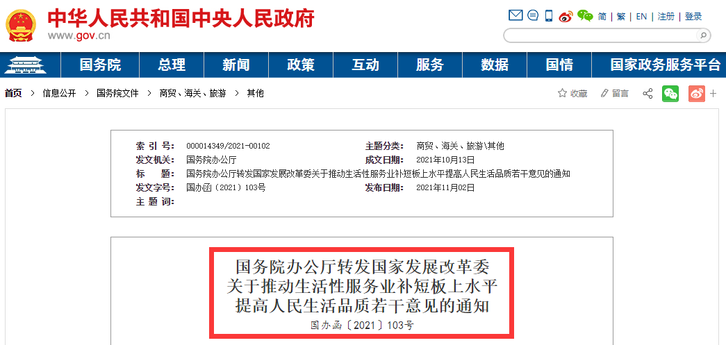 11月2日,国务院办公厅转发国家发展改革委《关于推动生活性服务业补短板上水平提高人民生活品质的若干意见》(以下简称“生活性服务业30条”)。