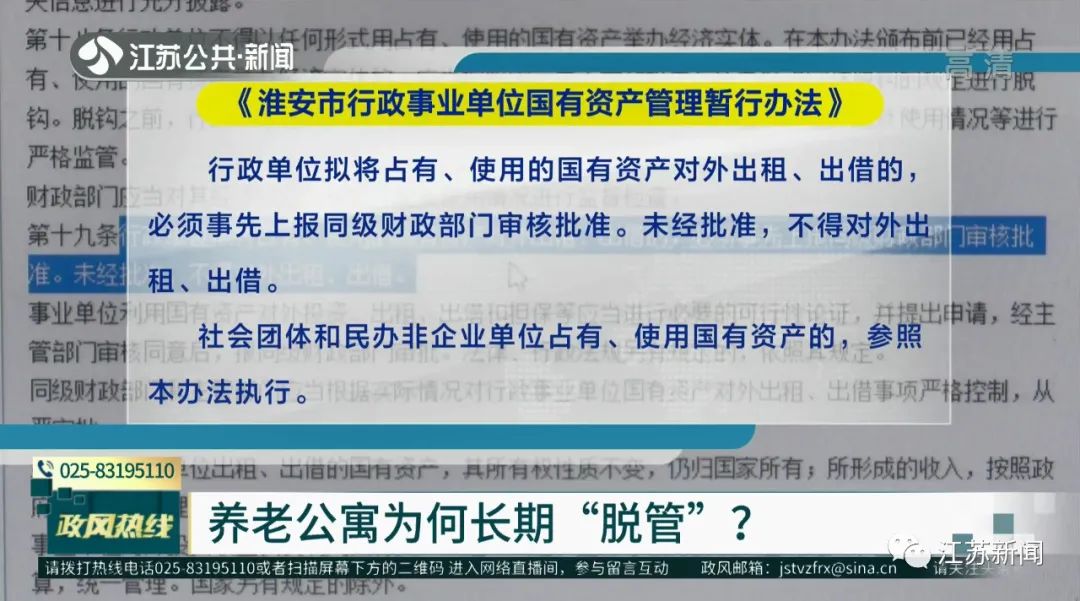 《江苏省行政事业单位国有资产管理办法》规定:行政事业单位国有资产未经批准不得处置,财政部门负责对行政事业单位国有资产实行综合管理。近日,淮安市民徐女士向政风热线反映,淮安市淮阴区养老公寓作为政府投资的养老项目,通过内部招标,承包给了民政局在职人员的家属,而家属又通过转租的方式对外出租,赚取差价。