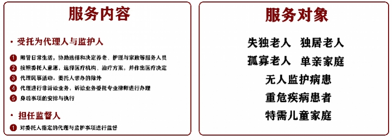 “平时我们会对被监护人进行日常探视,例如,我们与老人家或者委托人确立委托关系后,会定期去照顾他的日常生活,并形成记录表,反馈给我们的监督机构。”蔡盛称,还有会出现一些极端情况,例如老人家需要签字做手术时,亲人不在身边,基于老人家的授权,会有专业的医疗组织帮他签字做医疗决定。此外,中心还会通过社会监护中心联合公证处和信托公司对老人家的财产进行三方管理,提高对老人财产管理和财产安全以及包括人身安全的一个保障机制。