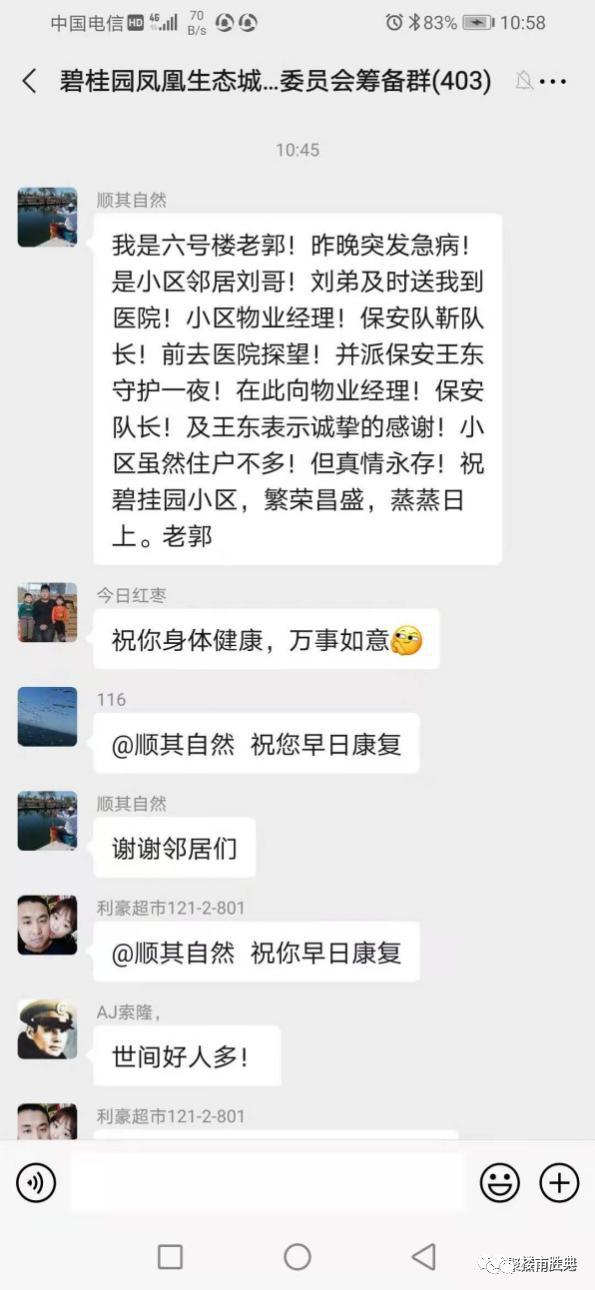 日前,64岁的郭大爷在碧桂园凤凰生态城业主群发了一段长长的感谢信,向邻居及物业表示感谢。原来,家住南大港碧桂园凤凰生态城的郭大爷,老伴在北京帮儿子带孙子,南大港家中常年是他一人居住。那天晚上他因突发急性胆囊炎和胆囊结石,疼痛难耐,在小区邻居及碧桂园物业人员的合力帮助下及时送往医院救治,才转危为安。在医院里,碧桂园物业人员帮助郭大爷办理挂号、缴费、住院等手续,并且一直守在郭大爷身边陪他做各种检查,直到病情稳定之后才松了口气。此时已近凌晨,碧桂园物业经理马争还安排工作人员留下值夜,直到郭大爷出院。