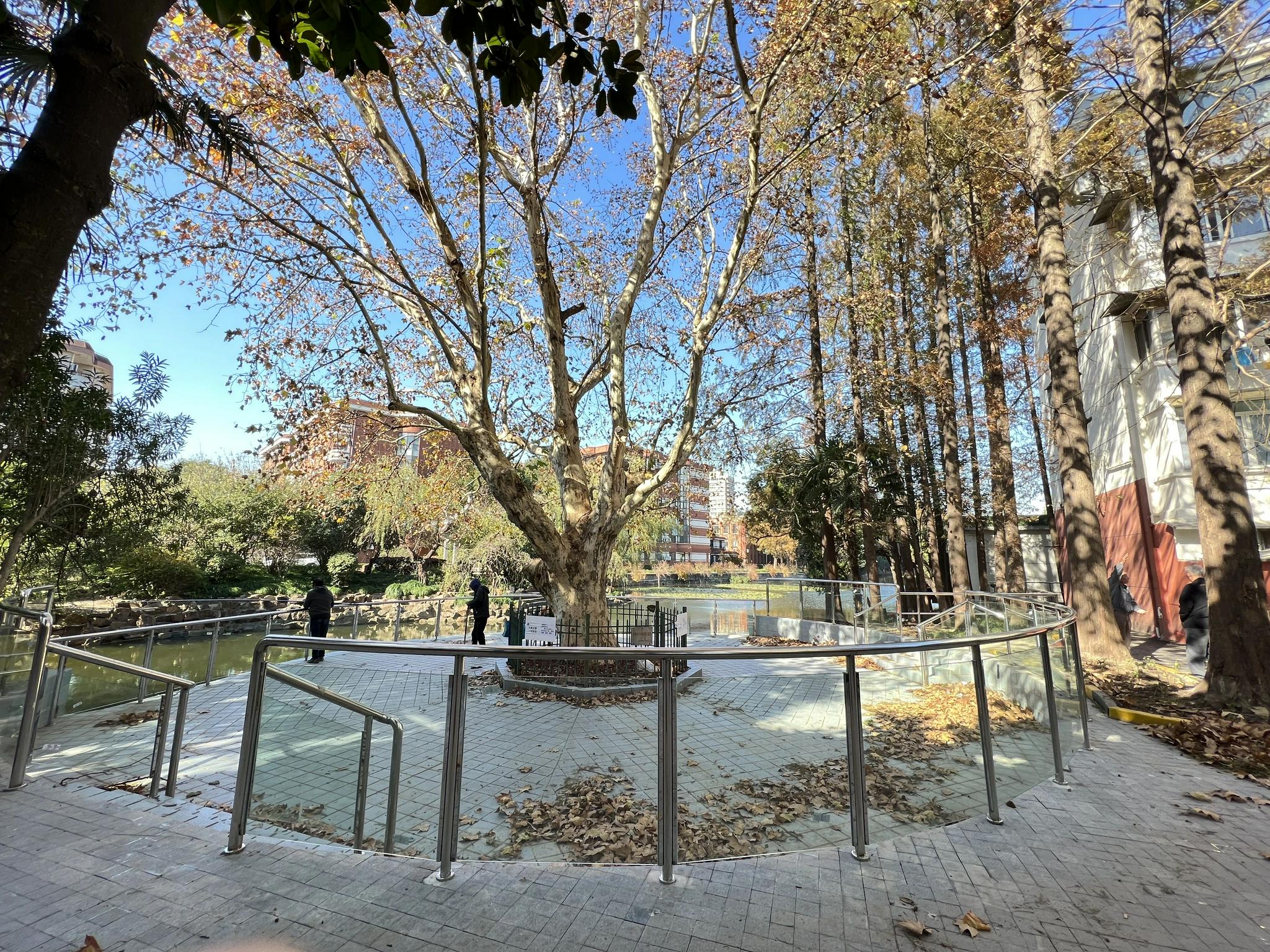 495号门前的亲水平台是丽娃河边的最佳观赏打卡点,也是附近居民休憩的主要场所。现在,环形玻璃护栏围绕着中央的参天梧桐,在蓝天白云的映衬下,波光粼粼的河面显得通透明净,但原先的设计方案并非这样。