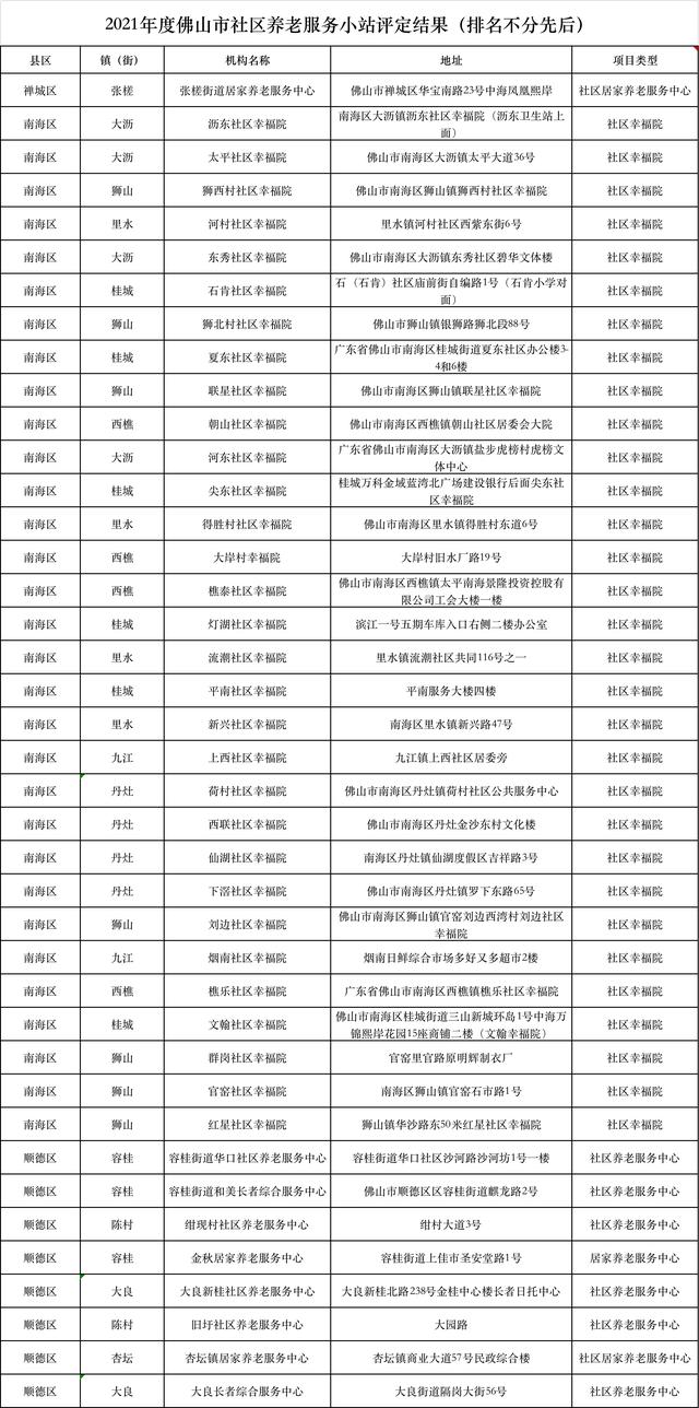 2021年度佛山市社区养老服务小站评定结果