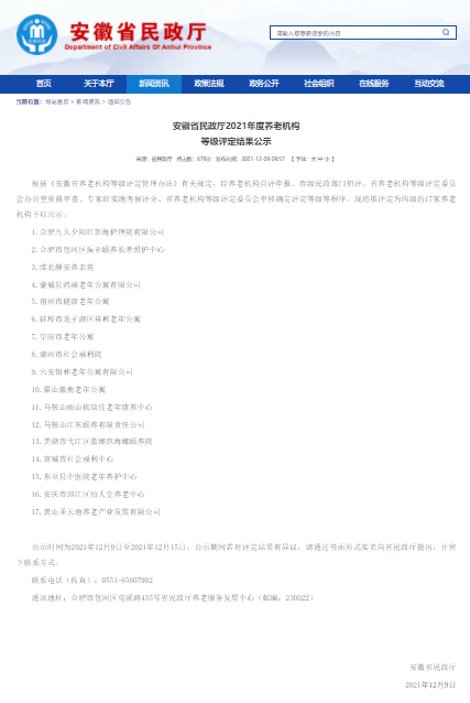 近日,根据《安徽省养老机构等级评定管理办法》有关规定,安徽省民政厅发布了2021年全省养老机构等级评定结果,本次共17家养老机构通过评定,成为安徽省首批四级养老机构。
