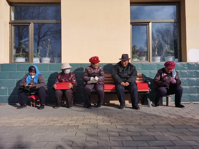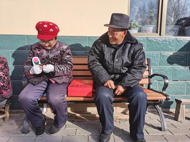 王金莲老人坐在屋前的小板凳上,一边晒太阳一边绣鞋垫,老伴贾明学搬着小板凳从屋里出来,坐在王金莲身边,静静地陪伴着……两位老人几年前在敬老院组成了新的家庭,共同安享晚年。