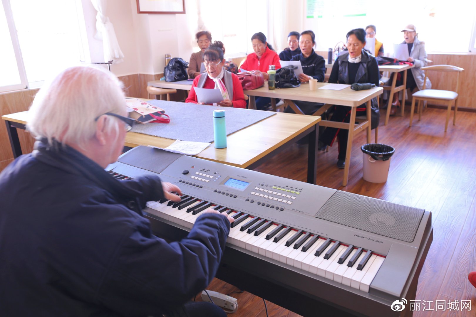 (2021年12月17日,丽江古城象山社区,老人们在日间照料养老服务中心里唱歌)