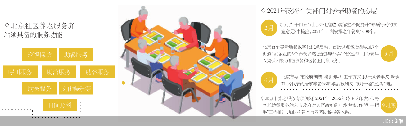 让王慧看到点希望的是,她从新闻中看到,在增加养老助餐点位的同时,北京市民政部门也在对接社会化平台,今年3月在西城区的3个街道4家企业的6个驿站已经展开“数字助餐”的尝试,这也是北京首个养老助餐数字化试点:通过与外卖平台签约,可为老年人提供团餐、到店点餐和送餐上门等服务。