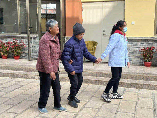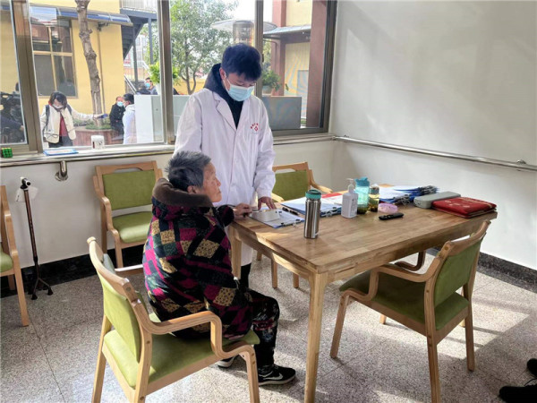 庭院里,几位老人正坐在椅子上晒太阳,并不时起身观赏庭院栽植的山茶花。一楼的大厅内,几名老人围坐一起说说笑笑,医护人员依次为老人们测量血压,并进行登记。