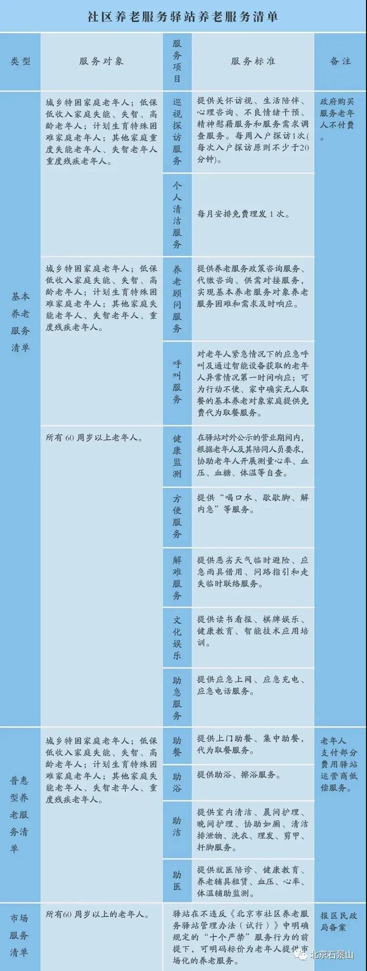 丰台区公布的养老服务驿站服务清单包括:基本养老服务清单、普惠型服务清单和市场服务清单。