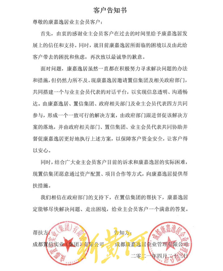 “2021年4月中旬,央视财经频道报道了康嘉逸居项目爆雷相关内容,部分会员陆续向公安部门报案,随后康嘉逸居发布了一封客户告知书,公司邀请成都置信集团以及相关政府部门共同搭建一个与会员代表的对话平台,主要由政府监督,由成都置信帮扶,一起督促并落实康嘉逸居退款方案。”李先生告诉记者,2021年5月中旬,政府部门相关人员、成都置信集团和康嘉逸居的领导以及会员代表们就退款事宜开会讨论。据李先生提供的会议情况通报内容显示,成都置信表示会拿出1亿-2亿元的资产作为帮扶来支持康嘉逸居退款方案的落地。政府相关部门表示会督促相关方案的执行,同时已经成立了专案组,正在积极调查中。