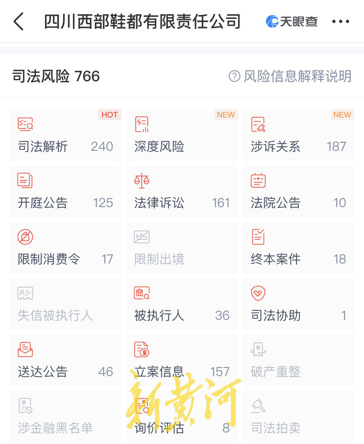 新黄河记者通过天眼查查询到,四川西部鞋都有限责任公司及其大股东成都置信实业(集团)有限公司现阶段均涉及了大量的民事诉讼纠纷,被多家法院列为被执行人,两家公司及其法定代表人已被相关法院采取了限制高消费令等强制执行措施。