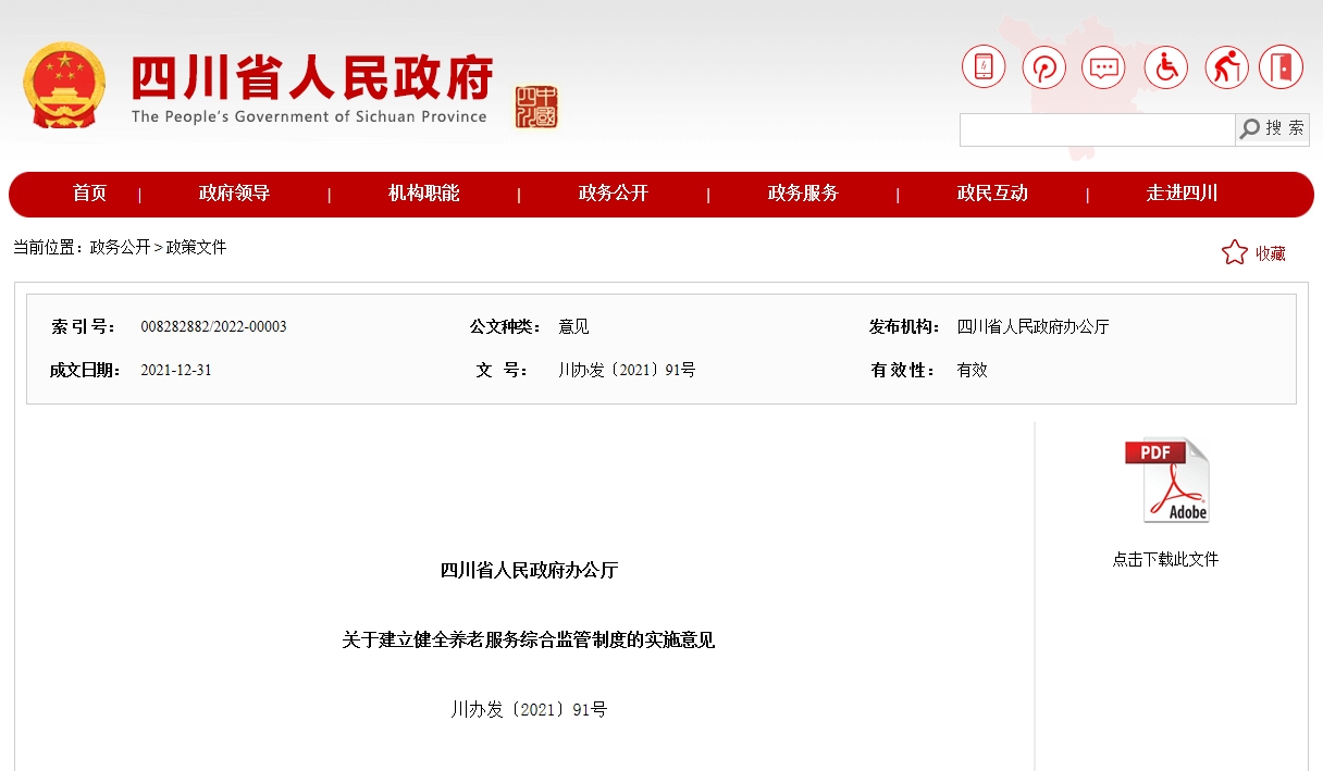 1月6日从四川省政府官网获悉,近日,省政府办公厅印发《关于建立健全养老服务综合监管制度的实施意见》(以下简称《实施意见》),旨在持续深化养老服务领域“放管服”改革,加快形成高效规范、公平竞争的养老服务统一市场,引导和激励养老服务机构诚信守法经营、持续优化服务,提升应急管理能力,促进养老服务高质量发展。