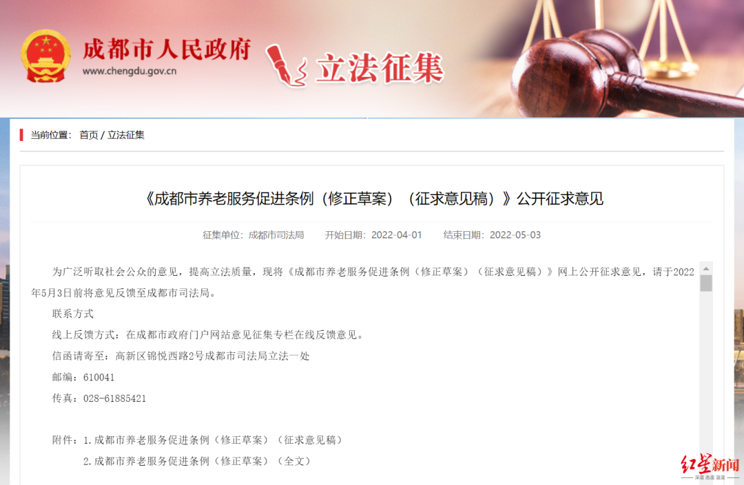 若市民对于《条例》有意见、建议,可于2022年5月3日前通过在成都市政府门户网站意见征集专栏在线反馈意见或发送信函至高新区锦悦西路2号成都市司法局立法一处等方式反馈至成都市司法局。