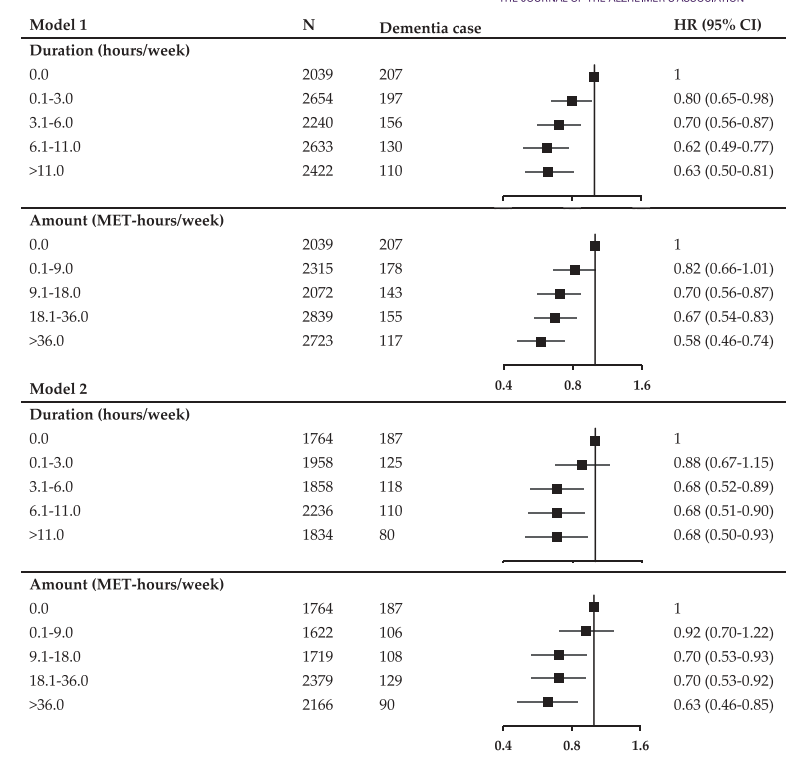 在模型1和模型2中,根据体育活动的能量消耗率(MET)分成四个组进行体育活动量和痴呆风险之间关系的研究,进一步验证了体育活动和痴呆风险之间的关。将体育活动能量消耗量分为四组:0.1至9.0 MET-hours/每周,9.1至18.0 MET-hours/每周,18.1至36.0 MET-hours/每周,>36.0 MET-hours/每周,在模型1中,HR依次为0.82、0.7、0.67、0.58,在模型2中,HR为0.92、0.70、0.70、0.63。