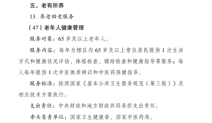 根据《国家基本公共服务标准》相关内容可知,65周岁及以上的老年人,每年可以免费享受健康状况评估、体格检查、辅助检查、健康指导、中医体质辨识和中医药保健指导等服务。不仅能省下一笔钱,还能很好地了解自己的身体健康状况,及时发现身体隐患,对延年益寿还是有很大作用的。