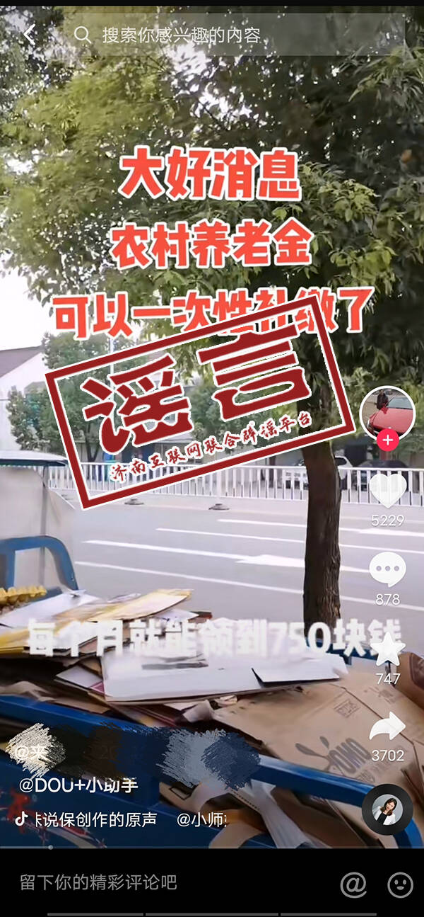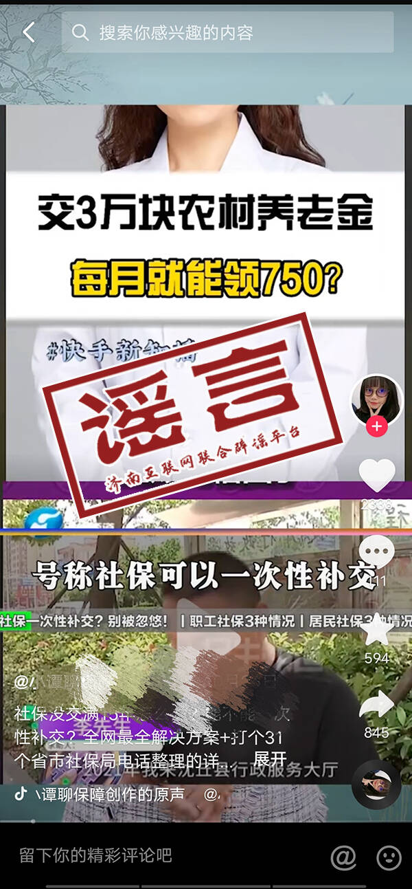 信息时代,没事刷刷短视频成为很多老年人的“爱好”。近期,有人在各类社交媒体、短视频平台传播多版本的“居民养老保险参保人一次性补缴3万元,每月就能领700元”的“社保教程”短视频,引发大量群众转发和咨询。记者从济南市社会保险事业中心了解到,此类信息是谣言。实际上,此前此类谣言也屡屡被疯传,业内人士提醒市民要提高识骗能力,关注官方消息。
