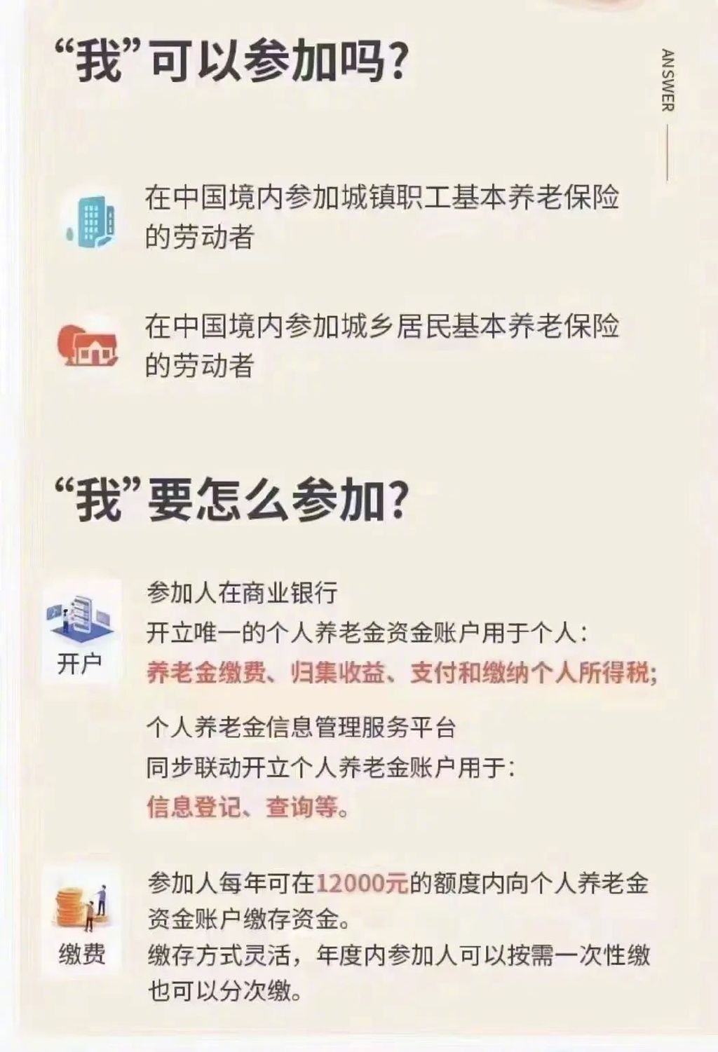 中国境内参加城镇职工基本养老保险、城乡居民基本养老保险的劳动者,均可自愿申请个人养老金业务,缴费由个人承担。当前,每年最高额度为1.2万元,账户收益归个人所有。