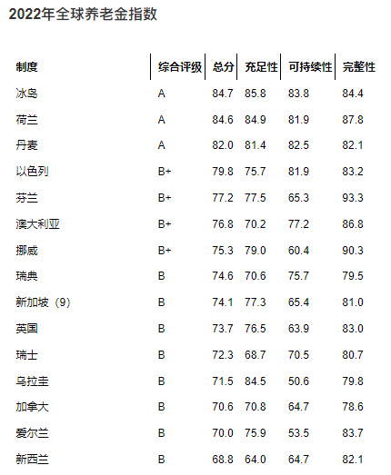 2022年美世CFA协会《全球养老金指数报告》利用可持续性、充足性和完整性三个分类指数来衡量各养老金体系,葡萄牙是榜单中的新成员。