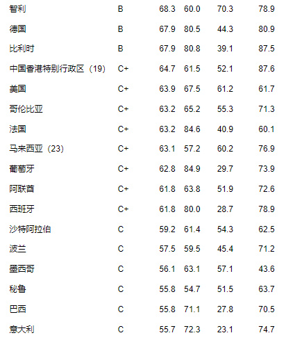 在亚洲,马来西亚(63.1分)和日本(54.5分)是进步最大的两个国家,前者从C级提高到C+级,后者从2021年的D级提高到C级。除评分标准修订因素外,马来西亚评级的上升还主要得益于净替代率较高,而日本则得益于养老金计划管理办法的调整。韩国(51.1分)也升到了C级,同时中国香港特别行政区(64.7分)、印度(44.4分)和中国台湾(52.9分)相比上一年也有所上升。泰国(41.7分)仍然在全球指数最低,但正在取得稳定进步。