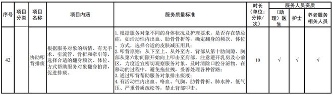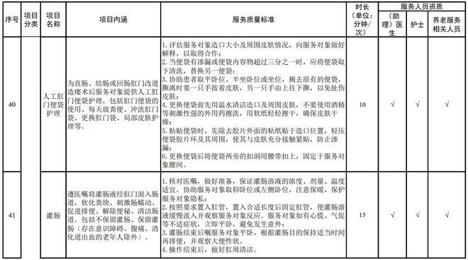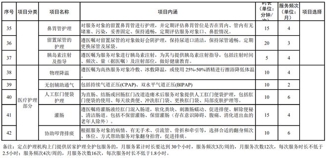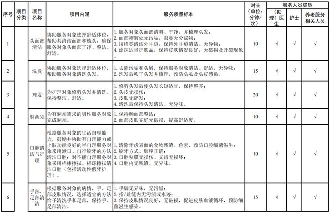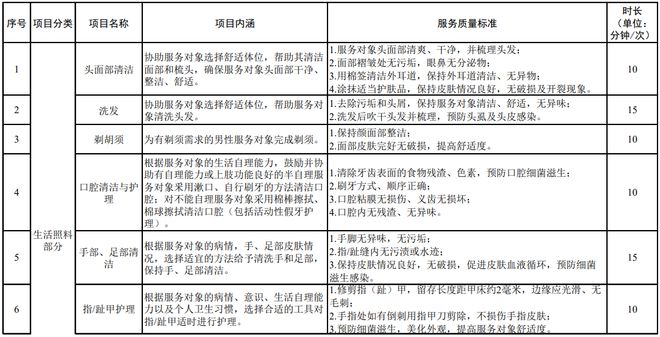 包括头面部清洁、洗发、理发、剃胡须、口腔清洁与护理、手部、足部清洁、指/趾甲护理、会阴护理、沐浴/擦浴、协助进食/水及指导、协助更衣及指导、整理床单元、协助排泄、体位变换、借助器具移动、协助床上移动、日常监测、血糖测量、安全防护指导、压疮预防护理及指导、人工取便、失禁护理、协助服药、皮肤外用药涂擦、生活自理能力训练、健康生活指导与精神慰藉、睡眠照护及指导、膀胱造瘘口护理及指导、结肠造瘘护理、其他造口护理、压力性损伤、护理及指导、伤口换药、人工气道护理、鼻饲进食、鼻胃管护理、留置尿管的护理、胰岛素注射及指导、物理降温、无创辅助通气、人工肛门便袋护理、灌肠、协助叩背排痰等42项具体内容。