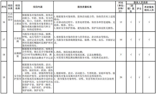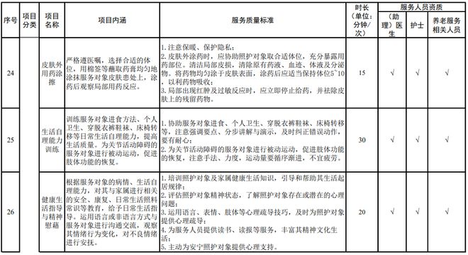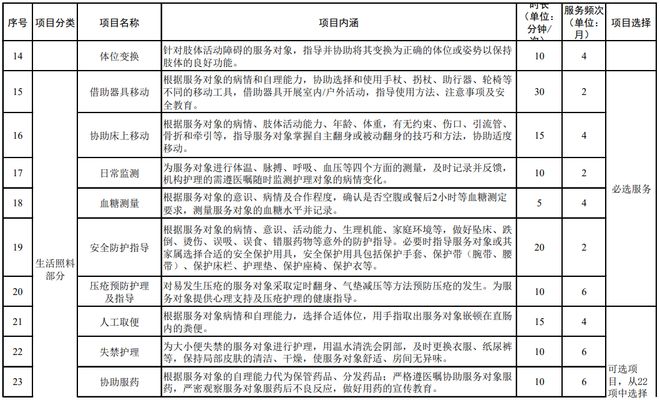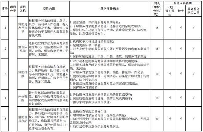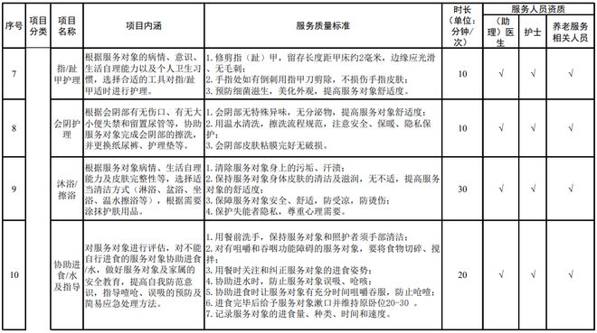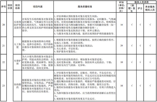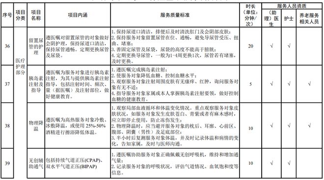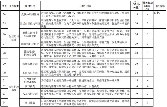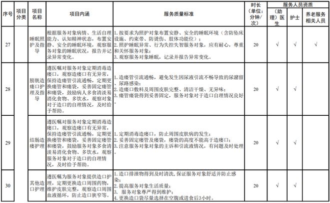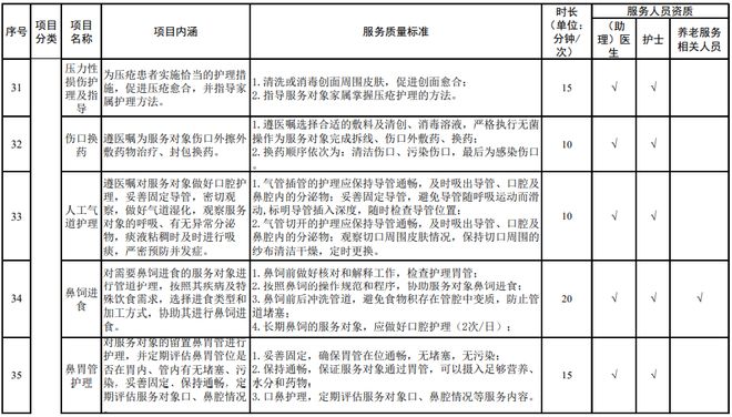 包括理发、会阴护理、沐浴/擦浴、协助排泄、协助床上移动、借助器具移动、血糖测量、压疮预防护理及指导、安全防护指导、失禁护理、人工取便、皮肤外用药涂擦、生活自理能力训练、健康生活指导与精神慰藉、膀胱造瘘口护理及指导、结肠造瘘护理、其他造口护理、压力性损伤护理及指导、伤口换药、人工气道护理、鼻饲进食、鼻胃管护理、留置尿管的护理、胰岛素注射及指导、物理降温、无创辅助通气、人工肛门便袋护理、灌肠、协助叩背排痰等29项服务内容。