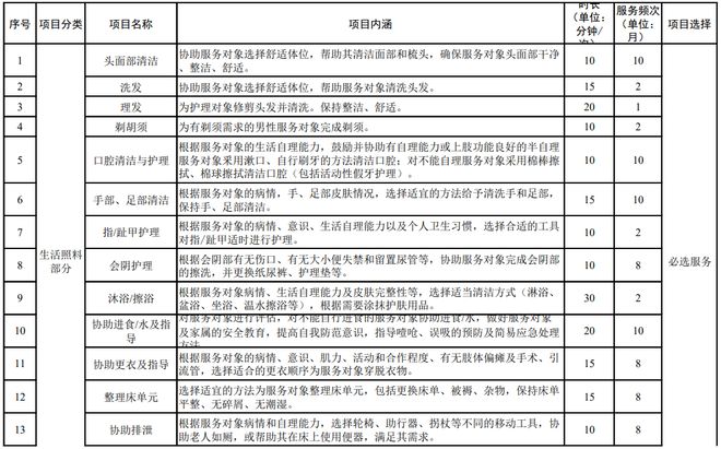 包括头面部清洁、洗发、剃胡须、口腔清洁与护理、手部、足部清洁、指/趾甲护理、协助进食/水及指导、协助更衣及指导、整理床单元、体位变换、日常监测、协助服药、睡眠照护及指导等13项服务内容。