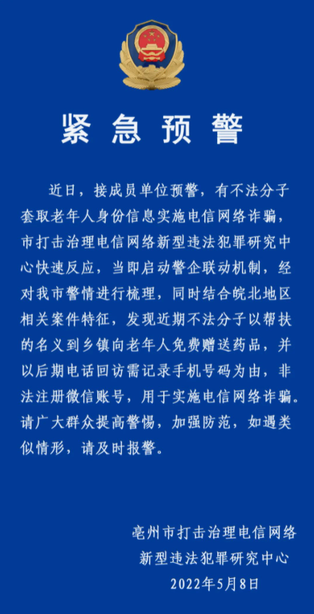 5月10日,据“亳州发布”微信公众号消息,近日,亳州市打击治理电信网络新型违法犯罪研究中心发布紧急预警。