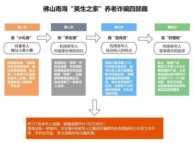 法院审理查明,2020年7月,甘某等4人在南海区大沥镇设立“美生之家”公司,并通过制定“顾客邀约话术”、精心设计布置办公室和讲课场所包装成一家 “养生公司”。公司成立后,在周边市场、公园等场所派发宣传单,以免费派小礼品等方式吸引老年人注意,以“养生保健”“慈善关爱”的旗号打消老年人顾虑,让老年人到公司听“养生课”。课中,又以送保健品、赠旅游、充值返利、拉客有奖等为诱惑,发展了一批老年人成为会员。其后,利用有些老年人不熟悉上网,该公司开发了所谓的在线理财平台,以“高回报”、“无风险”对外兜售理财产品,承诺老年人在购买理财产品后,可随时在线查询理财情况。为骗取老年人信任,公司还经常开展发放理财现金分红、免费赠送保健品和组织免费旅游等活动。先后有127名老年人被骗192万余元。