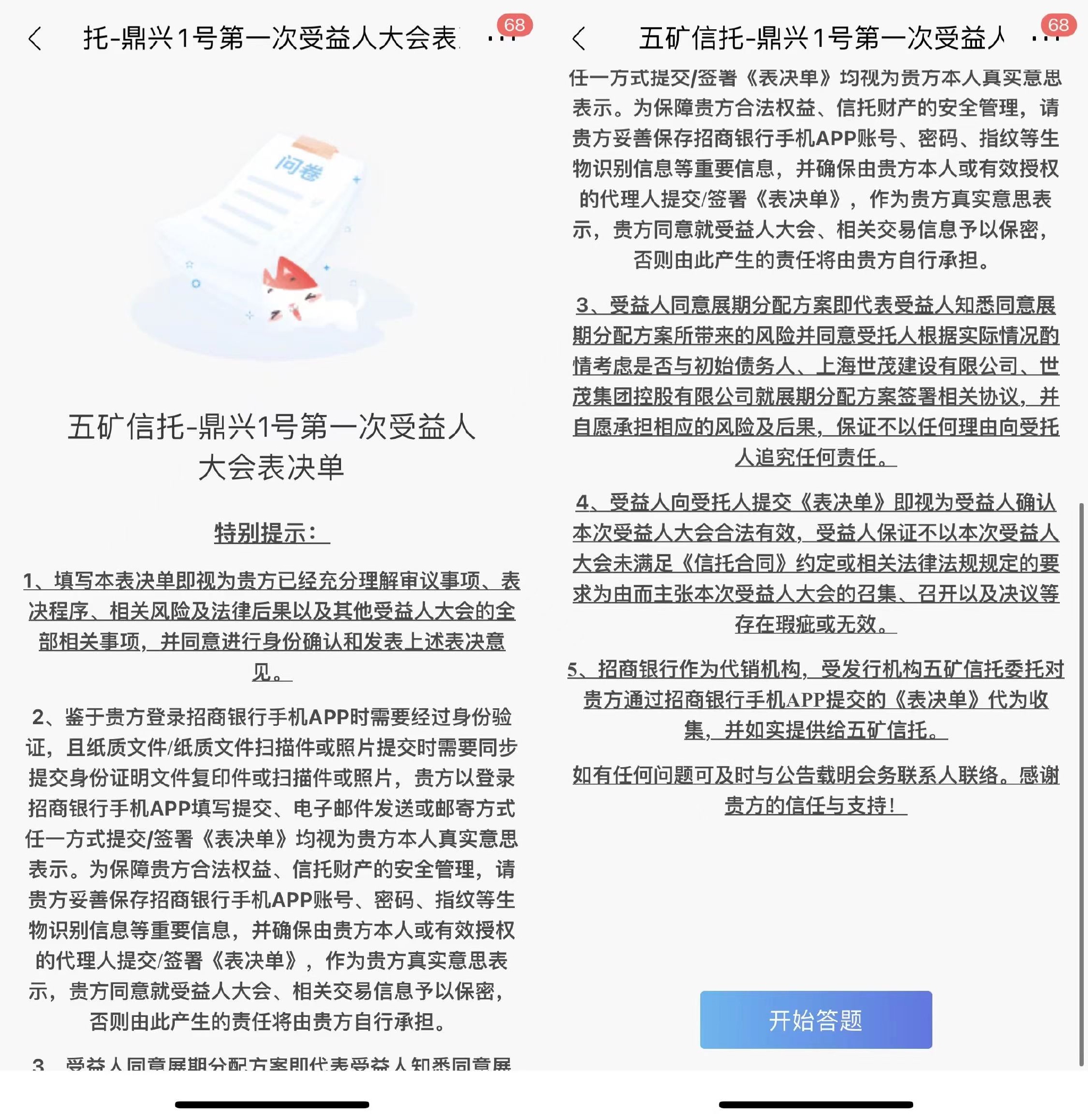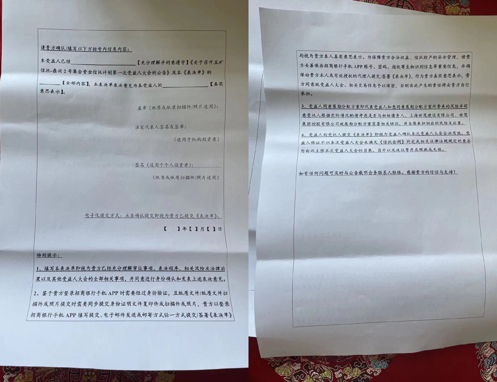 其中,第三条写道,“受益人同意展期分配方案即代表受益人知悉同意展期方案所带来的风险并同意受托人根据实际情况酌情考虑是否与初始债务人、上海世贸建设有限公司、世茂集团控股有限公司就展期分配方案签署相关协议,并自愿承担相应的风险及后果,保证不以任何理由向受托人追究任何责任。”
