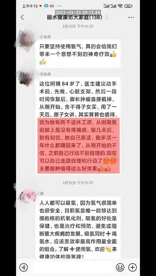 2022年3月29日,丽水市市场监管局接到群众举报,称莲都区曹承花健身器材经营部存在蓄意夸大、捏造吸氢气、喝富氢水有治疗疾病的功效,误导老年群体购买制氢机等设备。