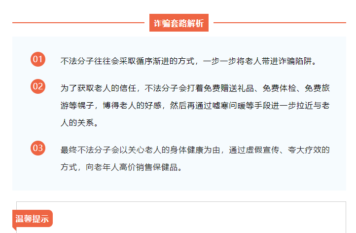 要识破此类保健品骗局其实并不难,首先要警惕各种以免费为名的保健品推销活动,不轻信、不购买;其次要养成正确的就医看病习惯,不要相信所谓“专家”的夸张宣传和神奇疗效,更不要相信有包治百病的的灵丹妙药。此外,子女的关爱对于防范保健品骗局也十分重要,在很多保健产品诈骗中,骗子会对老人关怀备至,嘘寒问暖。子女要更多和父母沟通交流,关心陪伴才是最好的“保健品”。