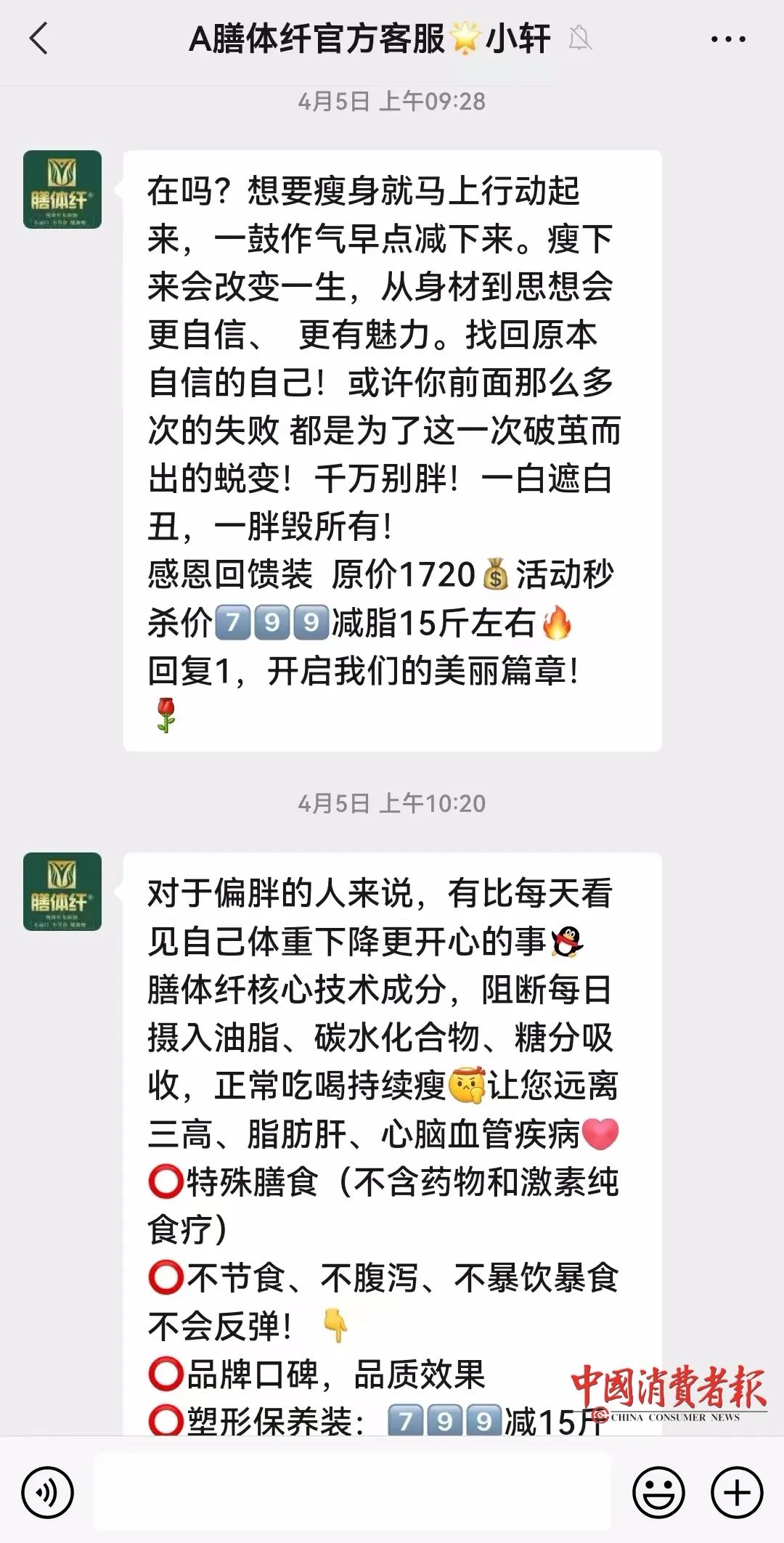 胡婆婆通过广告上的二维码,添加了一个网名为“A膳体纤官方客服小兰”的微信,并在对方介绍下购买了价格799元的“膳体纤茶”减肥套餐。