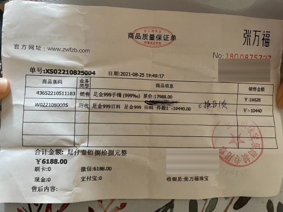 不少商家打着“以旧换新”的名义,吸引客户把旧款足金饰品置换成款式新颖但重量大幅打折的“一口价”金饰品,更有甚者在消费者不知情的情况下,将足金材质置换成硬金材质。网友张女士在黑猫投诉湖南站反映称,长沙雨花区乐尚城佰富联一楼张万福珠宝打着“以旧换新”的名义套路其六旬母亲。张女士介绍,自己妈妈手上有重7.55克黄金,黄金包含(戒指一枚、耳环一只、吊坠一个)和9.65克铂金项链一条,去年8月25日,其妈妈路过长沙雨花区乐尚城佰富联一楼张万福珠宝时,被店员诱导参与张万福珠宝举办的“以旧换新”活动,声称黄金可以保值增值,具有投资价值,面对洗脑式推销,张女士的母亲晕乎乎答应了。她将7.55克黄金和9.65克铂金项链交给店员,经过了“以旧换新”,补了9588元的差价后,得到了一只新的标价为17988元黄金手镯。该店店员还承诺此手镯永远价值17988元,可随时换购此店铺同等价值黄金。购买过程中张女士的母亲询问店员“可以称重吗?”店员称“现在都是按吊牌价‘一口价’销售的,不称重”,紧接着,店员继续称,“吊牌价比称重价黄金好,买了之后永远不会因为金价下调而贬值,永远值那么多钱。随时可以过来换新款”,但未告知换款需支付20%手工费。