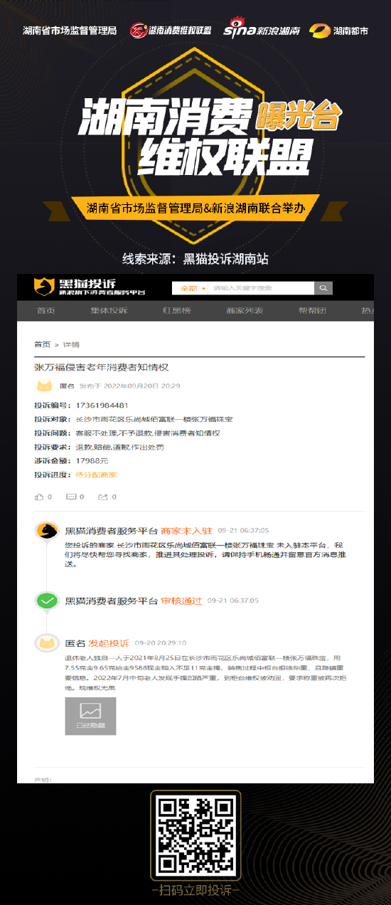 湖南消费维权联盟 工作人员多次拨打 @张万福珠宝 官方客服电话均无人接听。