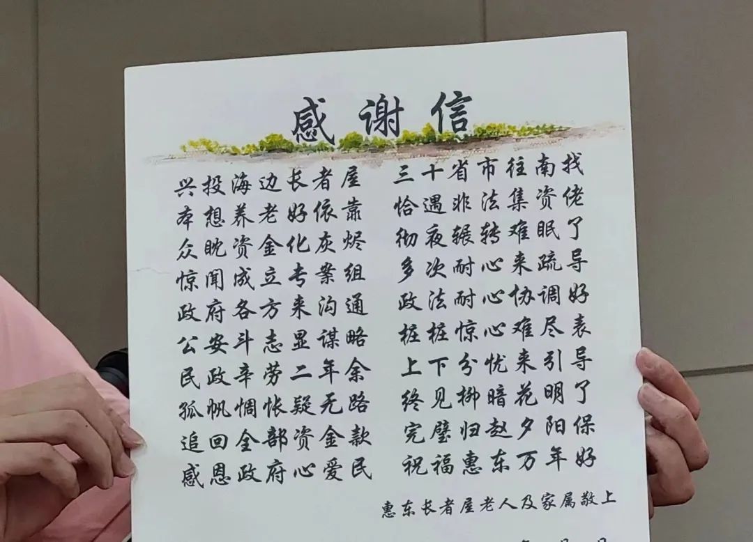 9月13日,惠东县召开打击整治养老诈骗专项行动典型案例宣传报道会议,并举行“长者屋”案件的会员代表赠送牌匾仪式。记者了解到,该案件今年8月基本实现长者群体非法集资退赔本金全覆盖,有力地维护人民群众特别是老年人的财产安全与合法权益。