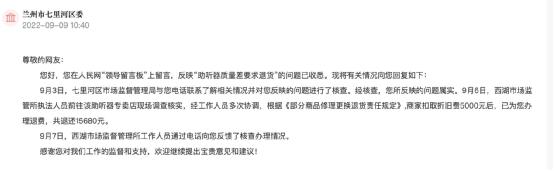 据王女士介绍,在办理留言的过程中,兰州市七里河区市场监督管理局的工作人员非常耐心,在详细询问事件经过后,多次与商家负责人沟通,并积极组织双方调解,最终帮助老人顺利退货退款。